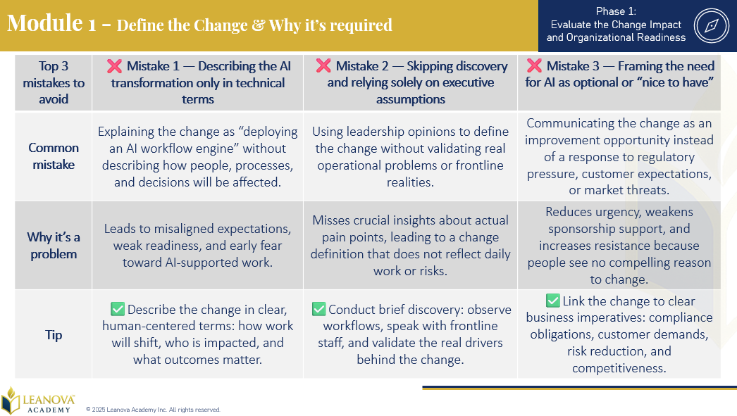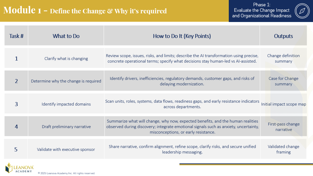 To ensure clarity, consistency, and global accessibility, lessons are presented by a virtual instructor using scripts personally written and reviewed by the President and Founder of Leanova Academy, a certified change management expert.