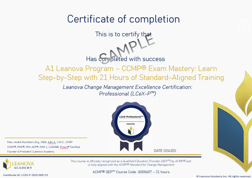 CCMP® Exam Prep Course — a self-paced 21-hour ACMP® QEP™ online training fully aligned with the ACMP® Standard (2nd Edition). Includes 45 modules, real-world deliverables, job instructions, templates, and everything required to meet the official 21-hour CCMP® eligibility requirement. This program also grants the Leanova Change Management Excellence Certification: LCeX-Professional™, the official digital badge, and the right to use the post-nominal LCeX-P™. Affordable, accessible, and globally trusted by professionals preparing for the CCMP® certification exam.