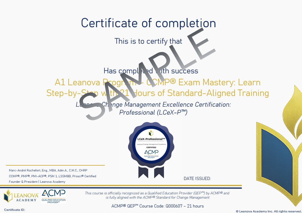 CCMP® Exam Prep Course — a Live Online Private for Corporate Groups 21-hour ACMP® QEP™ training fully aligned with the ACMP® Standard (2nd Edition). Includes 45 modules, real-world deliverables, job instructions, templates, and everything required to meet the official 21-hour CCMP® eligibility requirement. This program also grants the Leanova Change Management Excellence Certification: LCeX-Professional™, the official digital badge, and the right to use the post-nominal LCeX-P™. Affordable, accessible, and globally trusted by professionals preparing for the CCMP® certification exam..
